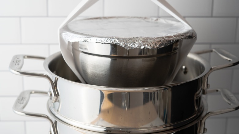 Use a long piece of parchment, folded lengthwise into a long, thick strip, to lower the bowl into the steamer basket, making sure it's not actually touching the water. Cover the pot and bring the water to a simmer over medium heat. Once the water is simmering, you can lower the heat to keep it at a steady simmer, not a boil.