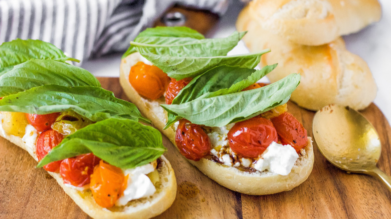 - Layer the baguettes evenly with the burrata. Top with the roasted tomatoes. Drizzle with balsamic, and add basil. Serve immediately.