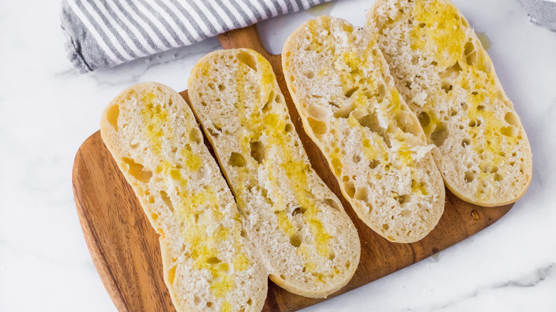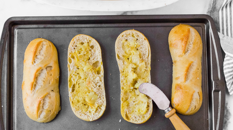 - Meanwhile cut the baguettes in half lengthwise. Drizzle the inside halves with the remaining tablespoon of olive oil.