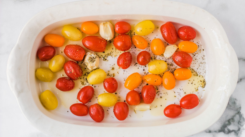 To start things off, preheat your oven to 400 degrees. You'll want it nice and toasty for the tomatoes. Next, take out a baking dish and place the tomatoes and garlic cloves in it. Remember, the garlic cloves should be whole and not minced or diced. Then, drizzle some olive oil over the top, and add salt, pepper, and Italian seasoning. Set your timer for 25 minutes and roast the tomatoes until they begin to burst. The aroma of garlic should also start to fill your home.