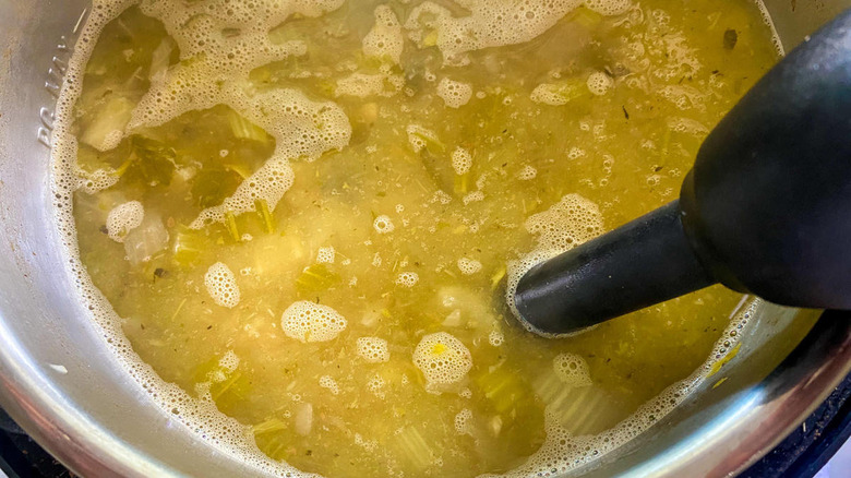 - Blend half the soup using an immersion blender.