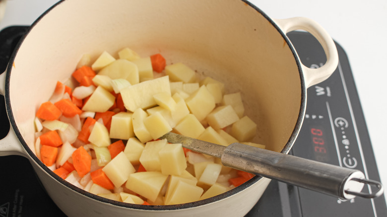 - Place the carrots and potato into the pot, and cook for 5 minutes.