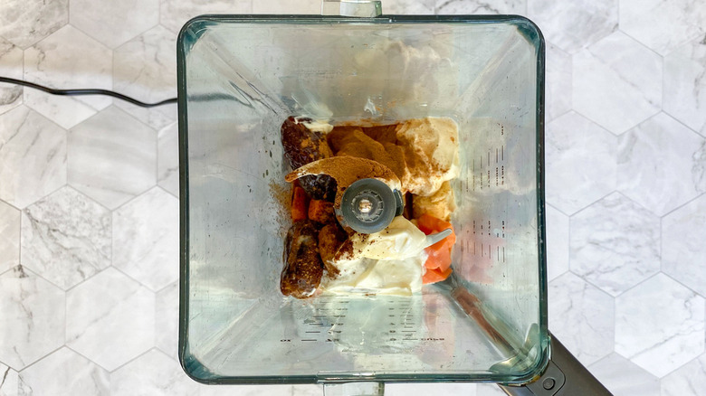 - Add the frozen sweet potato cubes, banana, almond milk, Greek yogurt, almond butter, dates, vanilla extract, cinnamon, nutmeg, and cloves to a blender.