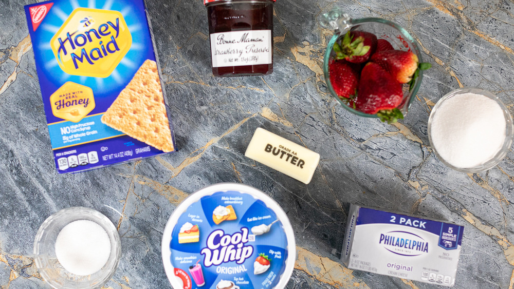 When in doubt (and the first time you prep any given dish), just follow the recipe for this no-bake strawberry cheesecake exactly. To do that, you'll need graham crackers, a cup and 2 tablespoons of sugar, ½ a cup of melted butter, about 1 cup of strawberries, 2 cups of cream cheese, a teaspoon of vanilla extract, 1 cup of whipped topping (Lee uses Cool Whip in this recipe), and about 4 tablespoons of strawberry jam.