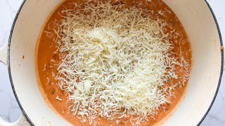 - Remove the pot from heat and add the heavy cream and ¾ cup mozzarella cheese, stirring to combine.