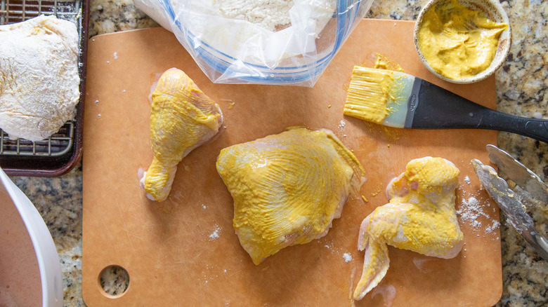 As you'll know if you've ever deep-fried your own chicken — or anything at all, for that matter — you need to dust the chicken (or other unidentified frying object) with a light coating of flour before you can get the coating to adhere. Recipe developer Kate Shungu from Gift of Hospitality notes, though, "The flour doesn't stick well to the chicken alone," so she got the idea of using mustard to help the flour stay in place. She also explains, "The mustard is a great way to add another layer of flavor to the finished dish."