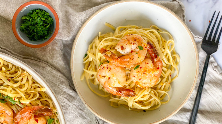 When you are ready to get started, head to the grocery store to grab all of the necessary ingredients. First, you will need a box of dried linguine and butter. In addition, grab some olive oil, minced garlic, and 1 pound of peeled and deveined shrimp. (MacLean notes, "[The] tails can be removed or left on, depending on [personal] preference.") You will also need salt and pepper, which you should have at home already.