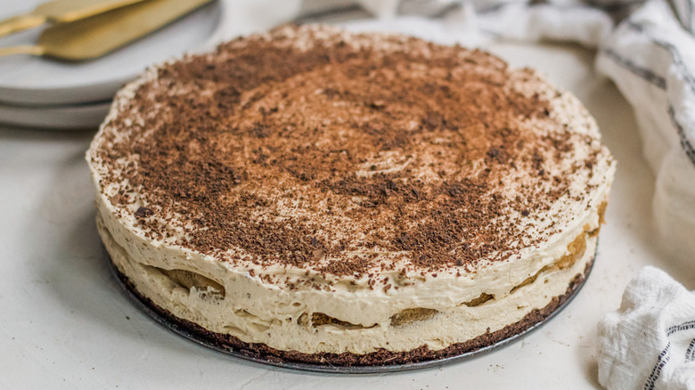 Once your tiramisu cheesecake is assembled, it still won't be ready to eat for a few more hours. Shelbert recommends freezing it for at least six hours or even overnight. Before you serve the cheesecake, you'll need to remove the ring from the springform pan. If you wish, you can also dust some cocoa powder over the top (Shelbert says this can easily be done using a sieve) or top it with a little grated chocolate.