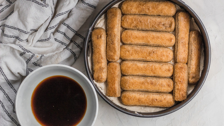The tiramisu layer is made from ladyfingers, of course, and these you'll soak in some additional espresso and Kahlua. If you want to make a non-alcoholic version, you can do so — Shelbert says to "just substitute strong brewed espresso for the Kahlúa." If you wish, you can also garnish your cheesecake with cocoa powder or grated chocolate.