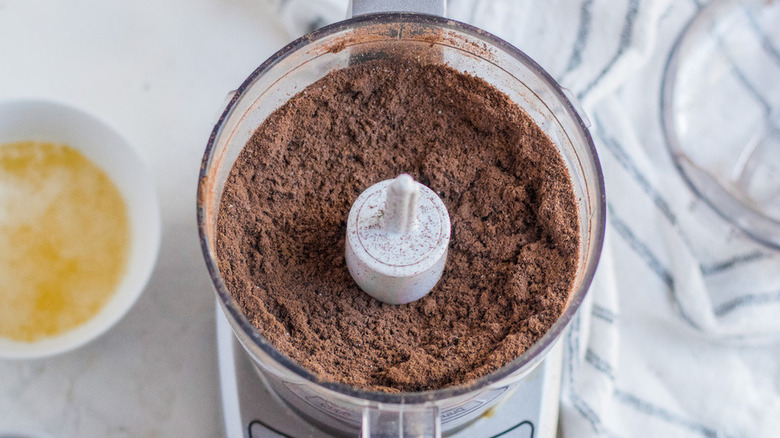 Begin by melting the butter in the microwave, or in a pan on the stove top, or even using your X-ray vision if you happen to be Superman. Next, grind up those graham cracker crumbs — Shelbert used a food processor for this part. When the crumbs are crumby, add the espresso powder and pulse or stir until these two ingredients are combined.