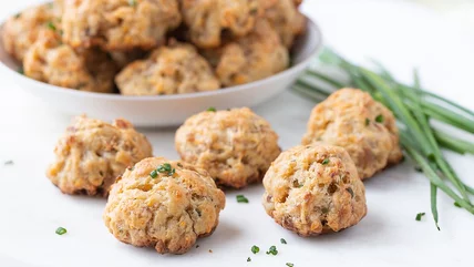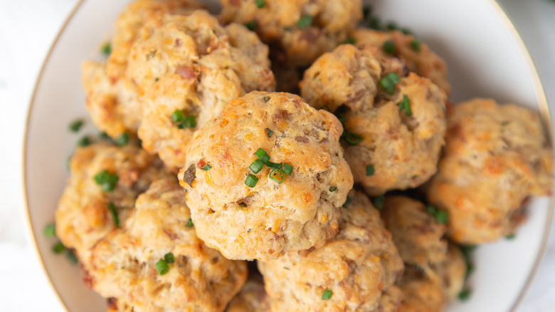 After the oven is done preheating and the sausage balls have chilled, bake them for 24 to 28 minutes — you'll know that they're done once they reach a golden brown color. Once you pull them out of the oven, optionally top with more chopped chives, then serve and enjoy! As for beverage pairings, Shungu notes, "Beer or white wine pairs really nicely with these."