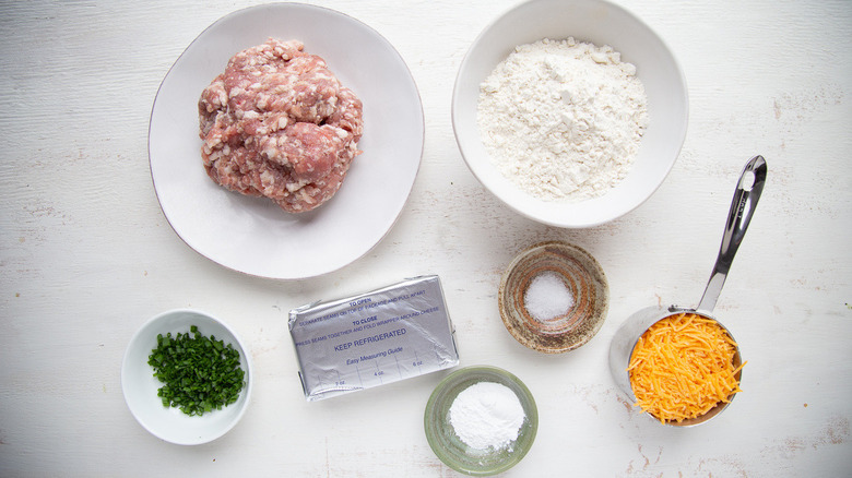 Before you can make these sausage balls with cream cheese, you'll want to make sure that you have the right ingredients. Naturally, sausage is the star of the recipe, and Shungu notes that there is some room for personal preference when choosing the pork. "You can use your favorite type of sausage (traditional, sage, Italian) and pair it with a complementary cheese," Shungu says. Speaking of cheese, you'll need both cream cheese and shredded cheddar — though you can also personalize the latter option. "Sage sausage pairs really well with cheddar (use sharp cheddar if you'd like)," Shungu explains. "And traditional sausage pairs nicely with Colby-Jack." Finally, to round out the dish, you'll simply need some flour, baking powder, salt, and chopped chives. It doesn't get much easier than that!
