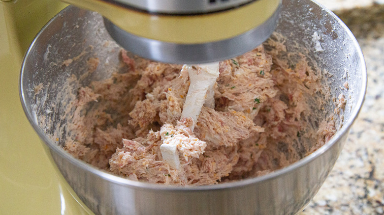 Not only are the ingredients for this recipe super simple, but the preparation is as well. First, line a baking sheet with parchment paper or a nonstick cooking mat. Now, grab your stand mixer, and toss in the sausage, softened cream cheese, flour, baking powder, salt, shredded cheddar, and chopped chives. Make sure that your mixer is fitted with the paddle attachment, and then mix all of these ingredients together on low, until they form a uniform "dough" of sorts. Shungu notes that it may take a few minutes for the ingredients to all come together.