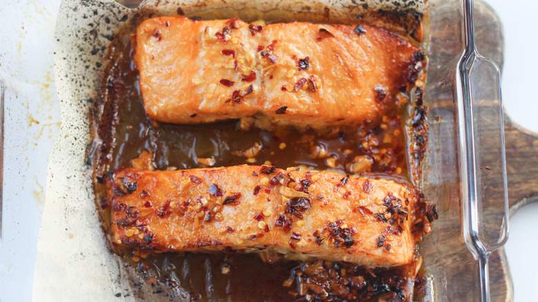 - Remove the salmon from the oven and garnish with additional red chili flakes before serving.