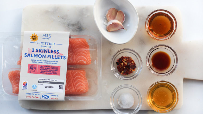 Assuming that you already have the salmon fillets on hand, you probably already have everything else needed for this recipe in your kitchen. All told, it calls for salmon fillets (you figured that out already), sesame seed oil, chopped garlic, red chili flakes (aka red pepper flakes), honey, soy sauce, and salt.
