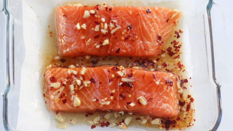 Now place the salmon fillets in an oven-safe dish (glass or ceramic, and you can use parchment paper if you want to make cleanup a bit easier), and then drizzle over them 2 tablespoons of sesame seed oil, 1 tablespoon of honey, and 1 teaspoon of soy sauce. Then sprinkle over 1 teaspoon of chili flakes, 1/8 of a teaspoon of salt, and those chopped garlic cloves.