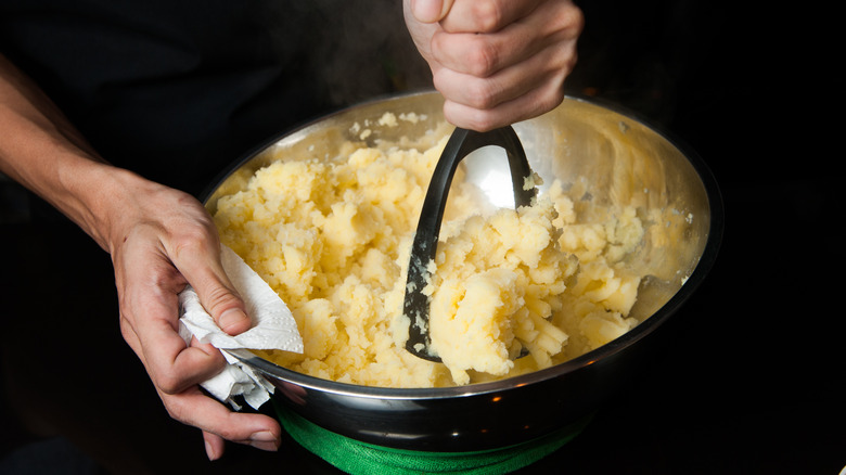 Take heart, though, as there are multiple fixes for this issue. The best course of action, ironically enough, is to continue cooking soupy mashed potatoes, says Buzzfeed. Simply add the watery mashed potatoes to a pot, then cook them on low heat. The extra water will gradually evaporate. Just be sure to keep an eye on the potatoes to make sure you don't go too far in the other direction and burn or overcook them. This remedy might require an extra step and a bit of patience, but it's certainly a lot easier than starting from square one and could save those mashed potatoes from public dishonor. Or, as Allrecipes recommends, you can grab a cheese grater and a few uncooked potatoes. Quickly boiling the grated potatoes, mashing them, and then adding them to your watery mess could improve the texture, though you'll obviously end up with more potatoes than intended.