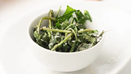 The main thing you'll need, however, is the dandelion greens themselves. Olayinka says that she used to grow her own, but she did buy the ones she's using here. "Farmers markets tend to have them," she advises, but also advises that you can "just ask your neighbors" or even check in your own yard.