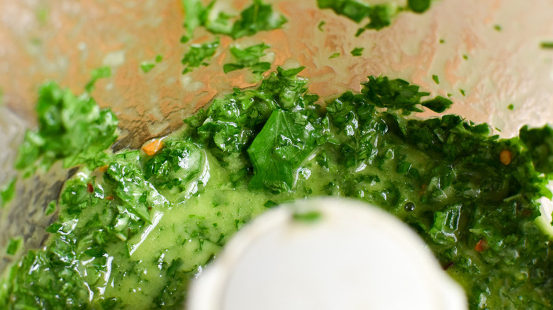 - Add the leaves to a food processor. Add the juice from the remaining lemon, ½ teaspoon of salt, the rest of the garlic, ¼ cup of olive oil, and the red pepper flakes. Pulse until the herbs are finely chopped (do not process until smooth), about 5 to 7 pulses.