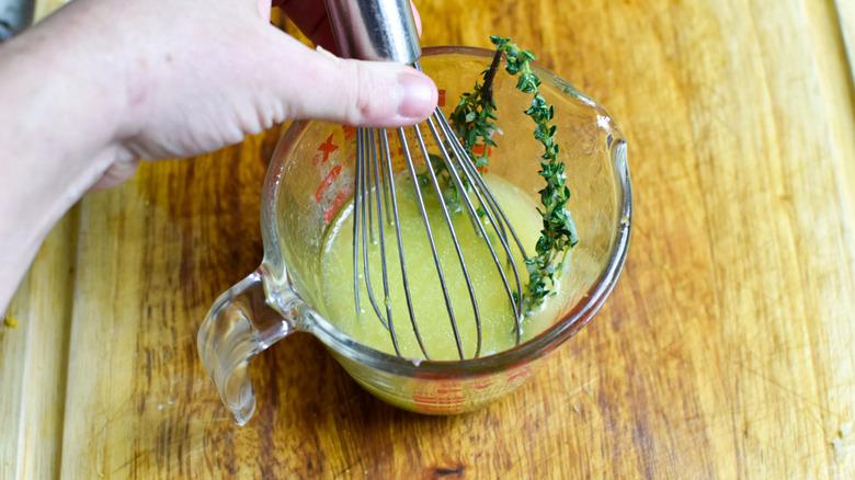 - Add 1/2 the garlic to the lemon and thyme mixture. Then, add ¼ cup of olive oil. Whisk to combine the marinade.