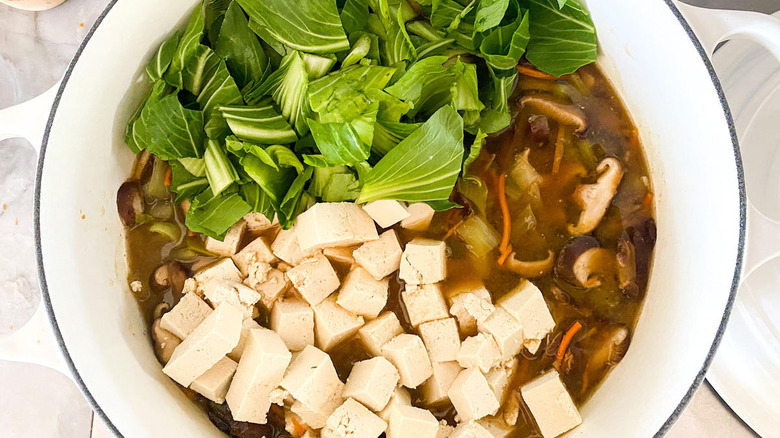 - Cube the tofu, and add it to the pot with the bok choy greens.