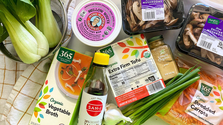 In addition, you will need 4 cups of vegetable broth, 2 garlic cloves (minced), 3 bundles of baby bok choy, 1 cup of shredded carrots (which you can purchase pre-shredded), 3 scallions (chopped, plus more set aside for topping the soup when serving), 1 tablespoon of white miso paste, 1 tablespoon of soy sauce, and 1 teaspoon of ginger powder. If you'd like a little heat, you can sprinkle your finished soup with dried red pepper flakes.
