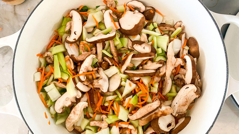 - Add the mushrooms, bok choy stems, shredded carrots, and scallions, stirring for 2 minutes.