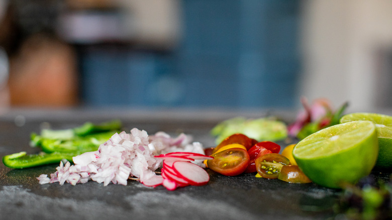 Start things off by washing all of your fresh ingredients — and yes, that includes rinsing the fish fillet well. Now peel and then dice the shallot (Okay, you didn't need to wash that one!), cut the tomatoes in half or into quarters if they are large, then slice the lime in half. (You can juice it, or plan to just squeeze the halves, just watch for any seeds if you go that route.)