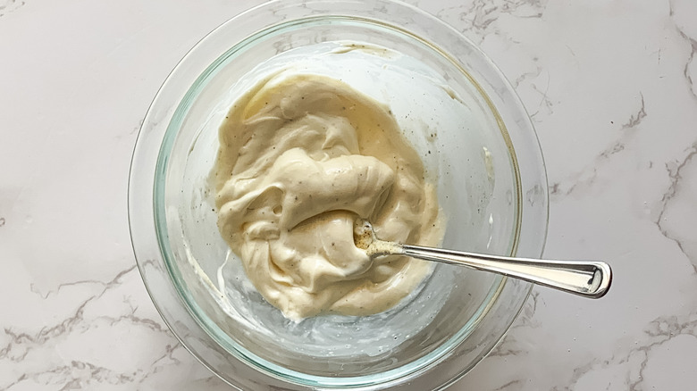 - In a small bowl, add mayo, vinegar, salt, pepper, and garlic powder. Stir to combine.