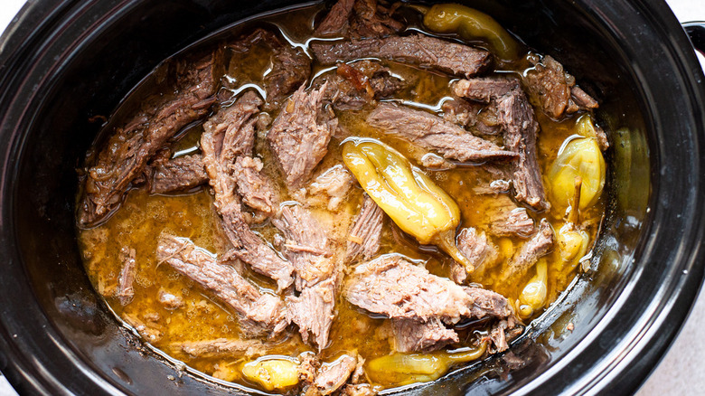 Now, it's time to grab your best friend in the kitchen — the crockpot. We love this because it simply just makes life easier. Go ahead and place the device on your counter, making sure that the space around it is clear. Take off the lid and place the chuck roast in first. Then, sprinkle the ranch dressing mix and the onion soup mix in. "Distribute seasonings evenly — some over the roast and some in the juices," Musgrave advises. Add the butter, a cup of pepperoncini peppers, and then ½ cup of pepperoncini juice to round everything out.