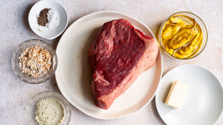 Now that you have committed to making this Mississippi roast, it's best to make a list of ingredients that you will need. Start with the bulk of the recipe: the meat. Grab a three-pound chuck roast and a little bit of salt and pepper. If you cook regularly, you likely have some at home already. "You could use a rump roast, also known as bottom round roast, instead of chuck roast," Musgrave notes. Then, pick up a few packets of flavoring, including ranch dressing mix and dry onion soup mix. To round out the grocery list, grab some unsalted butter and pepperoncini peppers. You will make use of the pepperoncini juice as well.