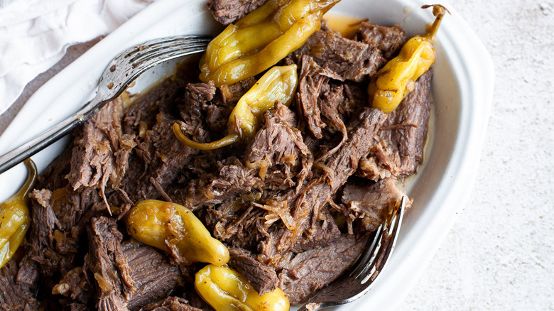 Recipe developer Christina Musgrave of Tasting With Tina came up with a take on Mississippi roast, and it is a master-class in savory goodness. "The best part of this recipe is how easy it is," she says of the dish. "There are only a few ingredients, and it's so delicious." So, you have something easy to make, affordable, and flavorful thanks to pepperoncini peppers and juice and a lot of tender meat — it doesn't get much better than that.