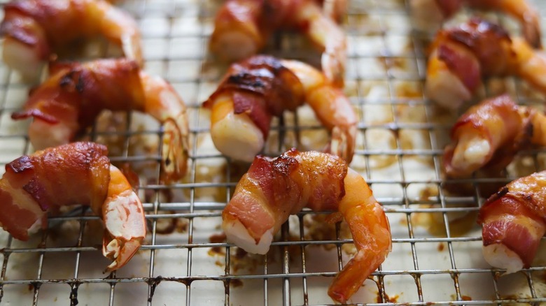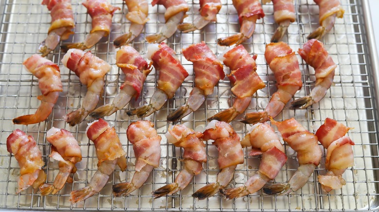 Once your timer goes off, or you've seen that the bacon has finished cooking, grab your oven mitts and remove the bacon. Then, grab your shrimp, because it's time to use it as well. Wrap each piece of shrimp with a strip of cooked bacon. Then, repeat the same steps with all of the remaining slices of bacon until you have used it all up. Next, place the bacon-wrapped shrimp on a wire rack. Put the shrimp seam-side down, so the bacon doesn't unravel in the oven.