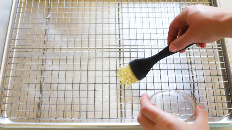 - Prepare a baking sheet with a wire rack and lightly grease the rack with oil.