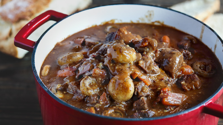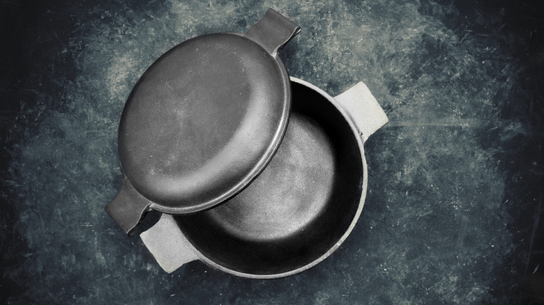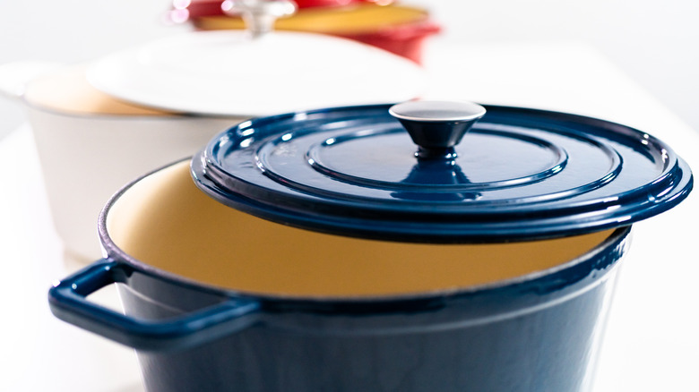Although the distinction is not commonly specified, Allrecipes clarifies that a Dutch oven is a cast-iron vessel while a French oven is coated with enamel. Pure cast-iron is highly praised by cooks, however, it needs to be treated with care in order to stand the test of time. Everything Kitchens points out that the material's durability makes it an option for campfire cooking. If you've ever cooked with cast-iron then you will know that the surface affects flavor to a certain extent. Unfortunately, it is not suitable for cooking highly acidic foods so if tomato sauce is regularly featured in your cooking repertoire, then you might want to rethink bare cast-iron.