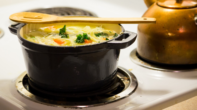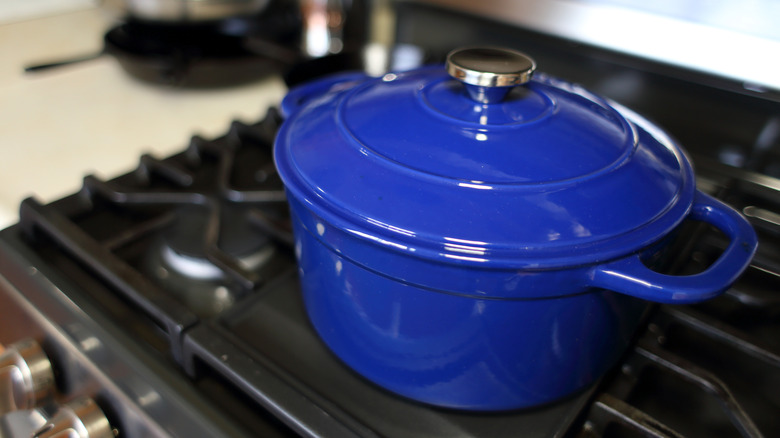 It's easy to think that the quickest way to increase the temperature of your Dutch oven is by setting your burner to high, but this method isn't helpful in the long run. Although the pot will take some time to heat up, once it is warm it retains heat exceptionally well. Consequently, The Kitchn advises sticking to low or medium heat and making sure there is some liquid in the pot to prevent burns and deterioration over time. Similarly, be sure to avoid large shifts in temperature or your enamel-coated Dutch oven risks cracking.