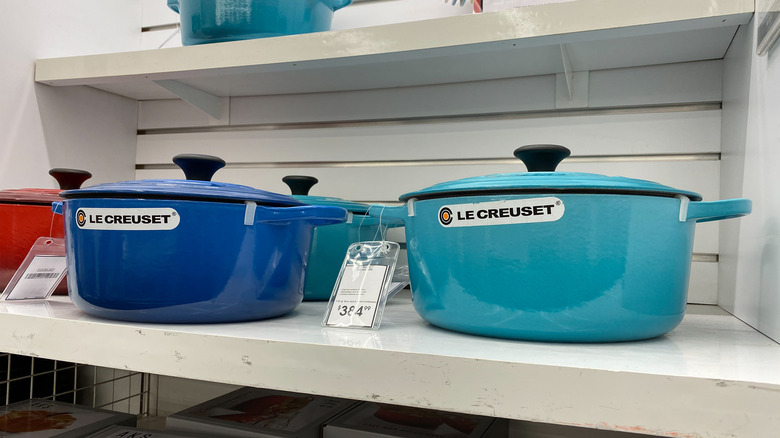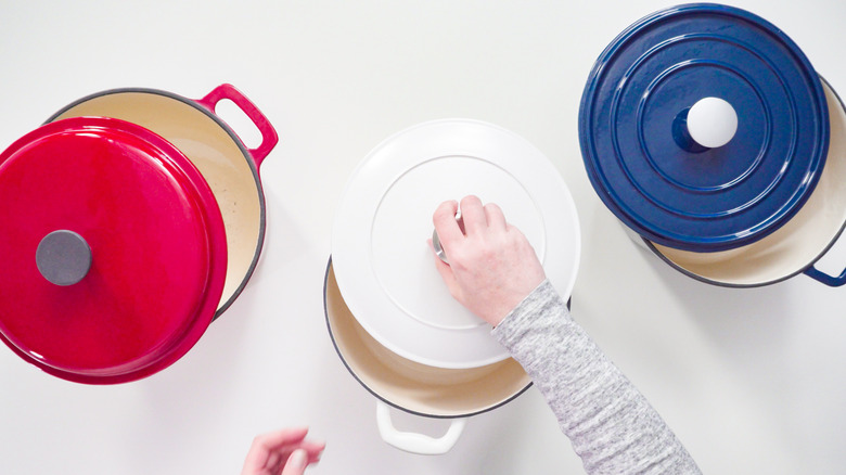 In terms of size, consider how many servings you want to fit in your pot. Are you cooking for one or a family of six? Next, think about the dishes you plan to make. Will you mostly use your cookware to bake bread or would you like it to fit a turkey? Eating Well points out that there's no use in buying a huge pot just in case because it will take ages to heat up. A 6 to 8-quart Dutch oven should satisfy the average home cook. This is where shopping in person can be helpful if your grasp on theoretical volumes is a bit shaky.
