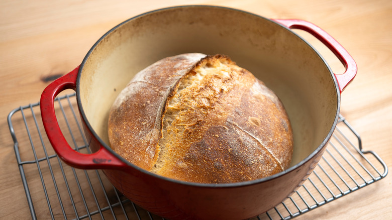 While rectangular sandwich loaves aren't the best fit for a Dutch oven, it works wonders for no-knead and sourdough bread thanks to the lid's airtight seal. This allows a buildup of steam inside the pot which ultimately produces a crusty exterior on the bread as well as air bubbles in the dough (via King Arthur Baking). In fact, Food52 identifies steam as the secret ingredient needed to make bakery-quality bread at home. This keeps the exterior of the dough damp so that it can stretch and grow from the inside out. While most people don't have steam ovens in their own kitchens, the effect can be mimicked with a Dutch oven.
