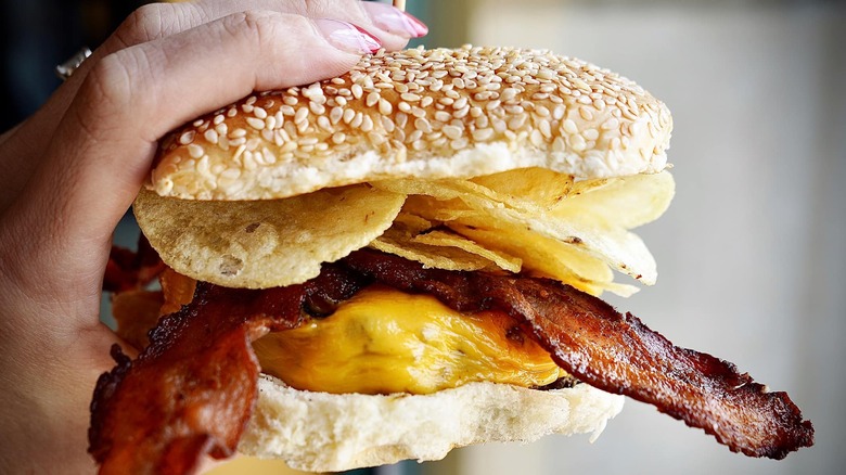 Yep, those thin fried slices of spuds that are always present at a barbecue aren't just for snacking. Most of the time that pile of chips sits nestled against the burger on your plate, but what about combining both of those delicious items into one rich, savory, and crunchy hand-held delight? Stacking a few chips on top of your burger lends a fantastic crunch to every bite, and it's a one-two punch of opposite textures that leave you scratching your head as to why you haven't always been eating burgers this way. Thanks to Flay, now you will.