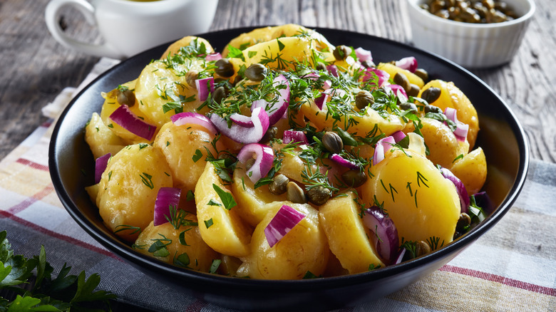 If you've ever worked in a kitchen, you know any seasoned chef has burned their fingers enough to create a Teflon-like surface on their fingertips that allows them to barehand piping hot food with ease. Most home cooks haven't torched their tips enough to handle such heat, and their natural inclination is to allow food to cool off before they handle it. Well, when making German potato salad, Bobby Flay implores you to muster up the courage to handle those hot potatoes like a boss, and it all has to do with the importance of the vinaigrette you use to dress to your boiled potatoes.
