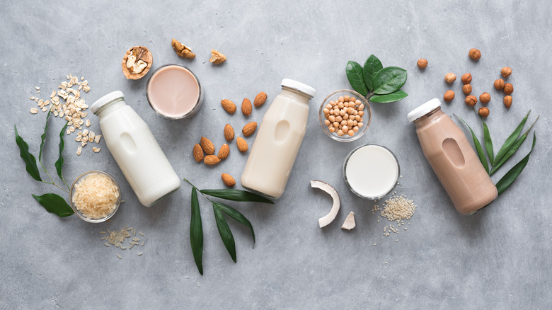 Whether you're using coconut, almond, or cashew milk, you'll begin the same way as you do with other substitutes. First, you'll measure 1 tablespoon of lemon juice or vinegar into a liquid measuring cup, then fill the rest up to the one-cup level with the milk of your choice (via Heart of a Baker). Remember that the main purpose of the lemon juice or vinegar in this substitution is to add enough acid to help activate your baking soda, and provide a slightly tangy taste to your final product. The plant-based dairy will add richness and moisture, even if it's not cultured like buttermilk.