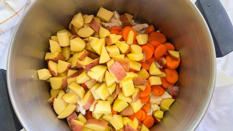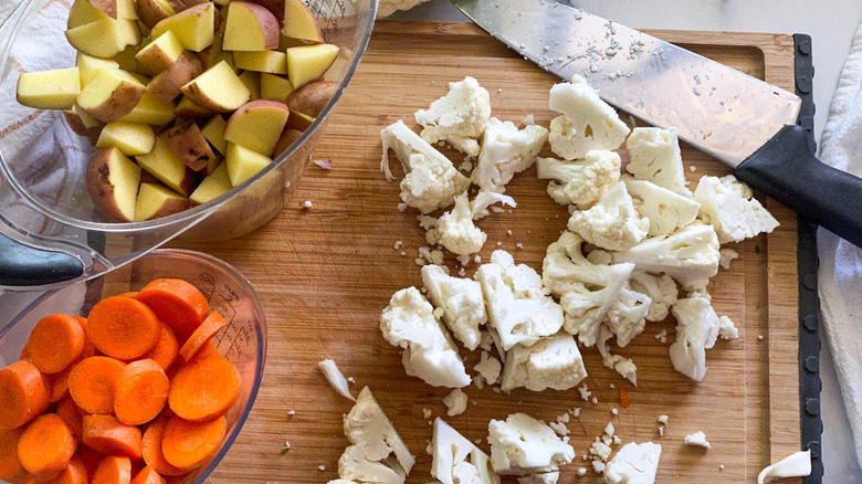 As this is a vegetable-heavy dish, you'll need to be sure to prep your veggies before cooking. Scrub and chop the potatoes, peel and slice the carrots, peel and quarter the onion, and peel and mince the garlic. With the cauliflower, you'll need to separate it into florets.