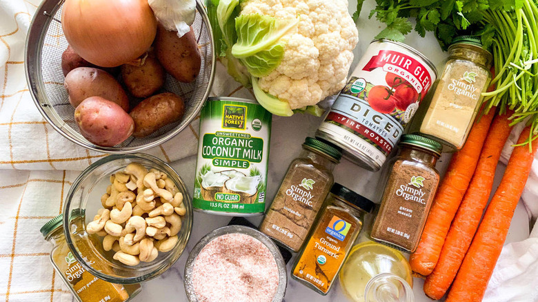 The vegetables Hahn uses to make this korma are red potatoes, carrots, cauliflower, an onion, some fresh garlic, and a can of fire-roasted tomatoes. Coconut milk and cashews make it thick and creamy, and you'll also need a little olive oil along with an array of spices: powdered ginger, coriander, curry powder, garam masala, and turmeric.