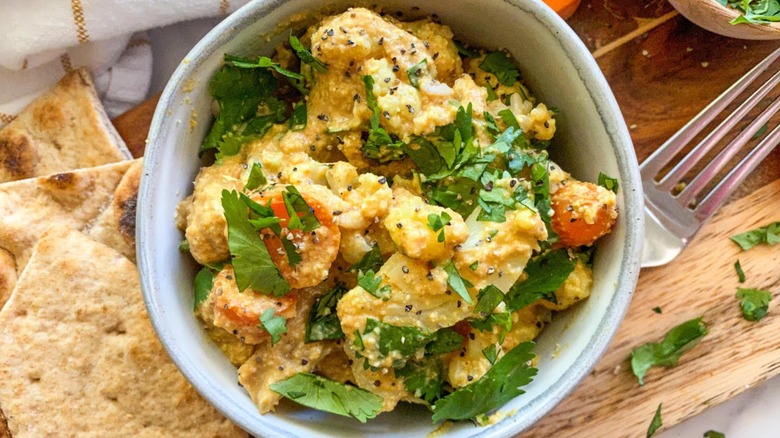 Hahn tells us, "This dish is great served with rice and naan or flat bread!" While she thinks of it as a main dish, she says it "does make a great side," adding "For meat lovers, you can add in chicken or meat of your choice."