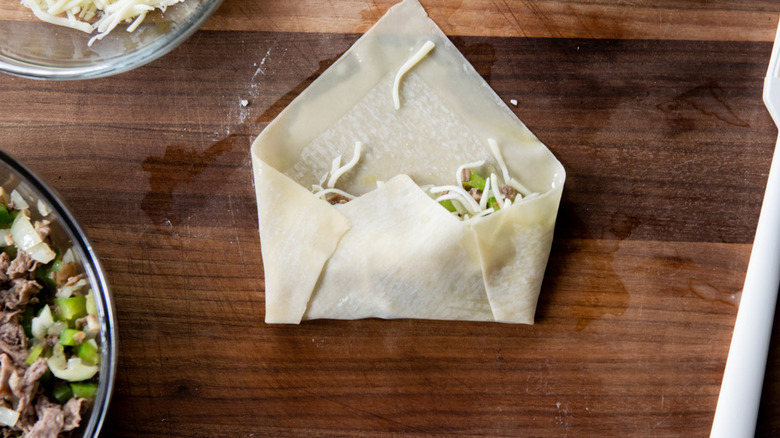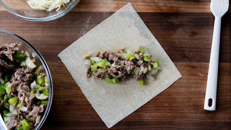 - Work with one wrapper at a time, storing the remaining wrappers under a damp paper towel to keep them from drying out. Place the wrapper on your prep surface with the corner facing you. Scoop ¼ cup of the shaved steak filling into the center of the wrapper. Top with a sprinkling of provolone.