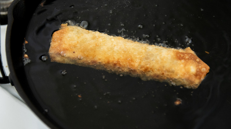 Once you've hit 350 degrees, carefully add two or three egg rolls to the oil, and listen for that sizzle! "If they brown within seconds, the oil is too hot," says McGlinn. "If they are not bubbling at all, the oil is too cold."