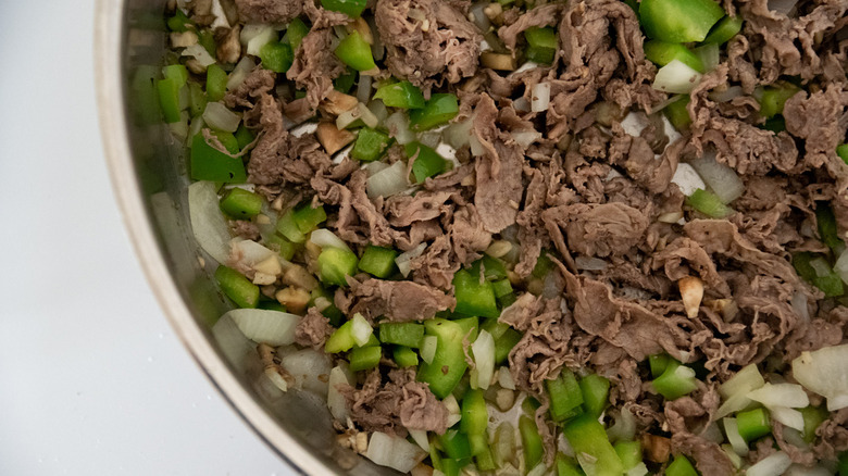 - Lightly oil a skillet and brown the shaved steak. When steak is nearly browned, add the diced pepper, onions, and mushrooms. Stir to combine, and sauté until the onions are softened, about 4 to 5 minutes. Season to taste with salt and pepper.