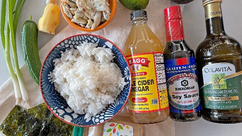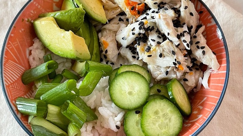 You may think a sushi salad would require multiple specialty ingredients, but no! Goldstein's recipe is super accessible, and a quick trip to your local store should supply you with everything needed to enjoy this fun meal whenever you'd like. Here is your shopping list: sushi rice, cooked crab meat, a cucumber, avocado, scallions, ginger, garlic, Dijon mustard, soy sauce, apple cider vinegar, your favorite extra virgin olive oil, and a lime.