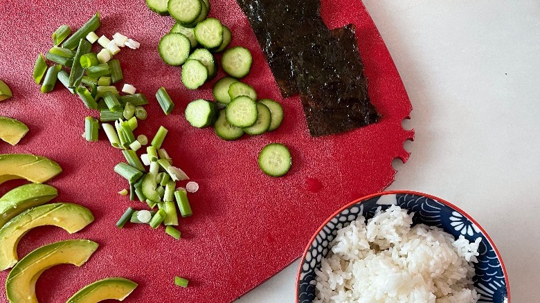 Meanwhile, you will cook your rice. Goldstein told Tasting Table, "I use sushi rice, but you can use any rice you want." So, if you are unable to find sushi rice at your local store, do not care for sushi rice, or if you want to pump up the health benefits of this bowl by making it with brown rice instead, that is completely fine. You will simply cook your rice of choice to the package instructions. Then, your cooked rice gets divided into two serving bowls.