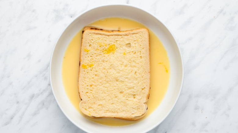 - Dip a sandwich into the egg mixture, covering both sides thoroughly.